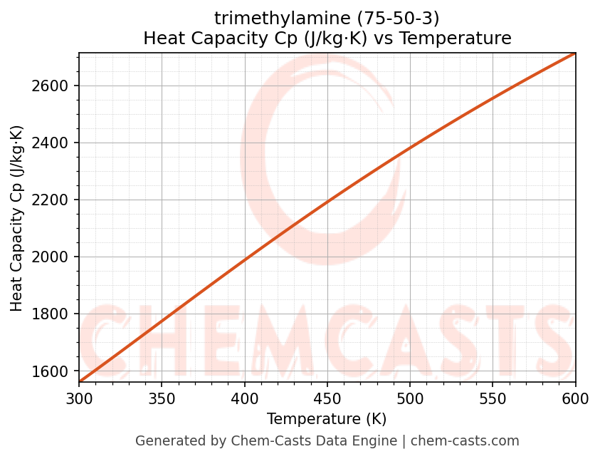 - Specific heat capacity (Cp) indicates the amount of energy required to raise the temperature of trimethylamine and is critical for energy balance and heat-exchanger design.
