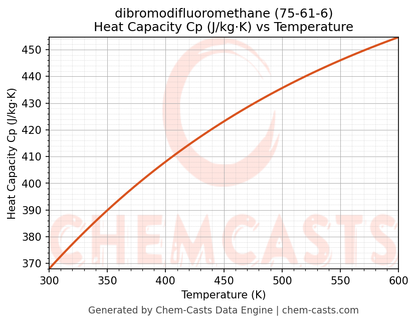 - Specific heat capacity (Cp) indicates the amount of energy required to raise the temperature of dibromodifluoromethane and is critical for energy balance and heat-exchanger design.