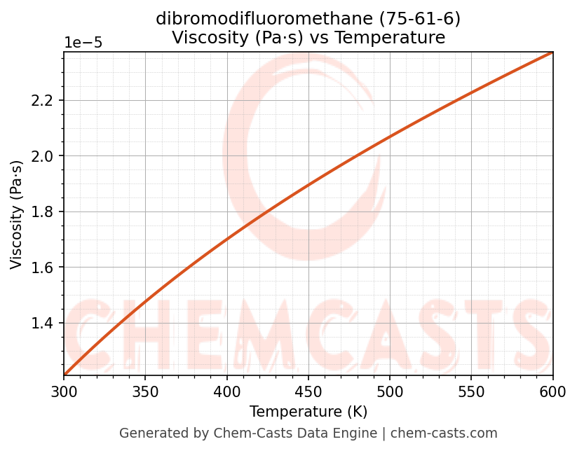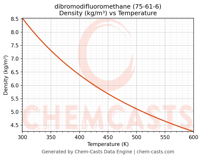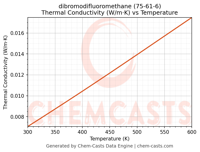 This page presents the temperature-dependent thermodynamic and transport properties of dibromodifluoromethane (CAS 75-61-6) calculated at a constant pressure of 1 atm (101325 Pa) over the temperature range 250-500 K.