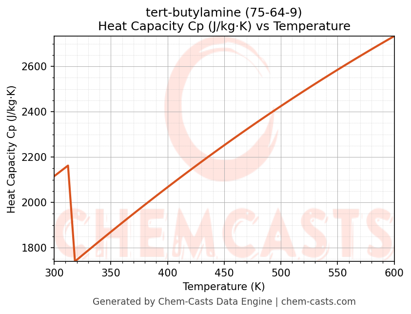 - Specific heat capacity (Cp) indicates the amount of energy required to raise the temperature of tert-butylamine and is critical for energy balance and heat-exchanger design.