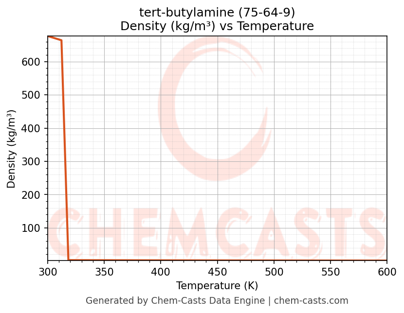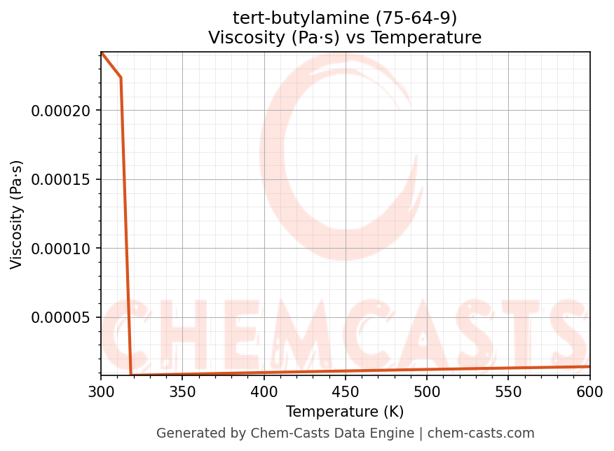 This page presents the temperature-dependent thermodynamic and transport properties of tert-butylamine (CAS 75-64-9) calculated at a constant pressure of 1 atm (101325 Pa) over the temperature range 250-500 K.