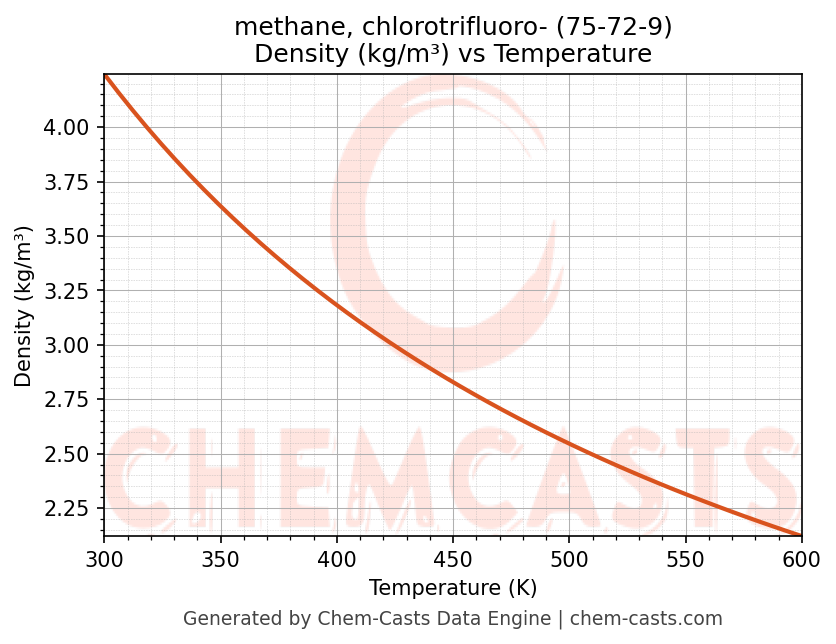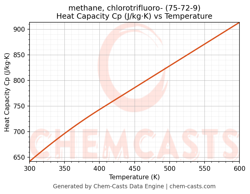 - Specific heat capacity (Cp) indicates the amount of energy required to raise the temperature of methane, chlorotrifluoro- and is critical for energy balance and heat-exchanger design.