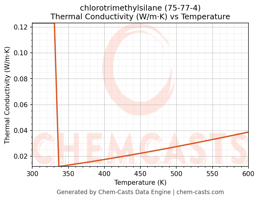 This page presents the temperature-dependent thermodynamic and transport properties of chlorotrimethylsilane (CAS 75-77-4) calculated at a constant pressure of 1 atm (101325 Pa) over the temperature range 250-500 K.