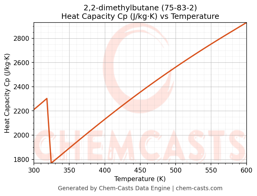 - Specific heat capacity (Cp) indicates the amount of energy required to raise the temperature of 2,2-dimethylbutane and is critical for energy balance and heat-exchanger design.