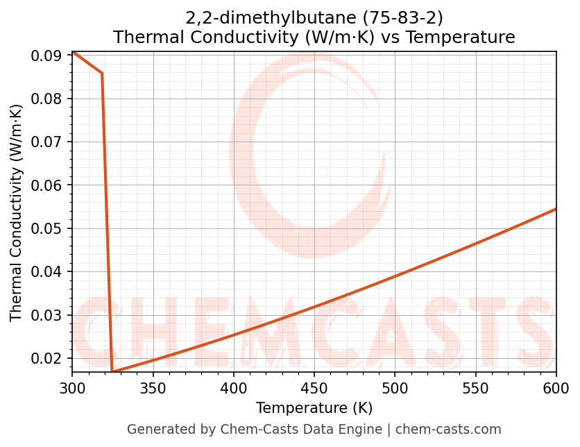 This page presents the temperature-dependent thermodynamic and transport properties of 2,2-dimethylbutane (CAS 75-83-2) calculated at a constant pressure of 1 atm (101325 Pa) over the temperature range 250-500 K.