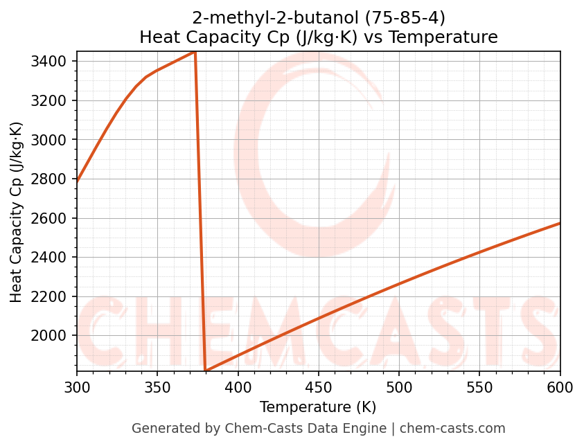 - Specific heat capacity (Cp) indicates the amount of energy required to raise the temperature of 2-methyl-2-butanol and is critical for energy balance and heat-exchanger design.