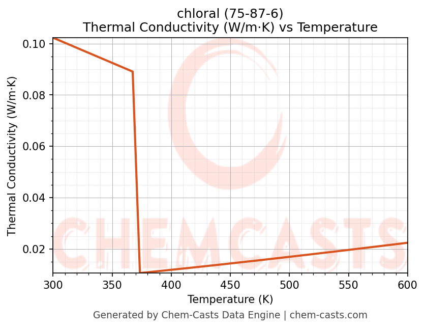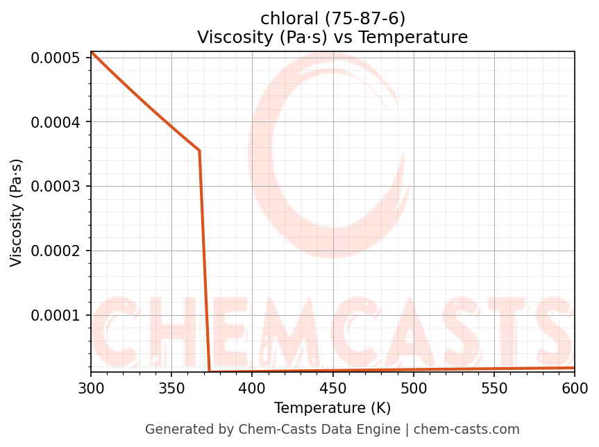This page presents the temperature-dependent thermodynamic and transport properties of chloral (CAS 75-87-6) calculated at a constant pressure of 1 atm (101325 Pa) over the temperature range 250-500 K.