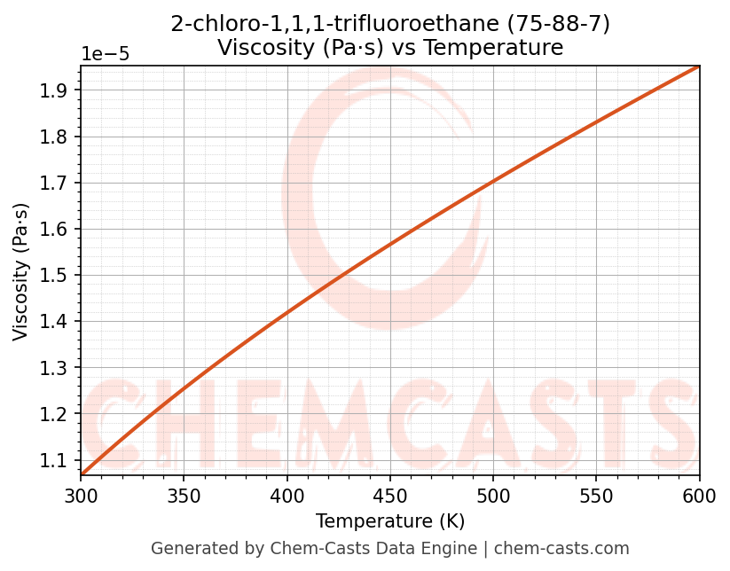 This page presents the temperature-dependent thermodynamic and transport properties of 2-chloro-1,1,1-trifluoroethane (CAS 75-88-7) calculated at a constant pressure of 1 atm (101325 Pa) over the temperature range 250-500 K.