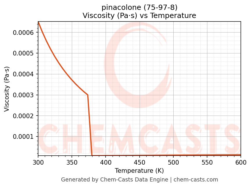 This page presents the temperature-dependent thermodynamic and transport properties of pinacolone (CAS 75-97-8) calculated at a constant pressure of 1 atm (101325 Pa) over the temperature range 250-500 K.