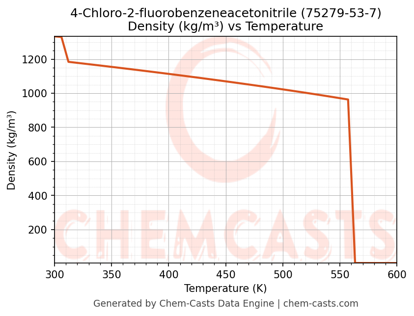 This page presents the temperature-dependent thermodynamic and transport properties of 4-Chloro-2-fluorobenzeneacetonitrile (CAS 75279-53-7) calculated at a constant pressure of 1 atm (101325 Pa) over the temperature range 250-500 K.
