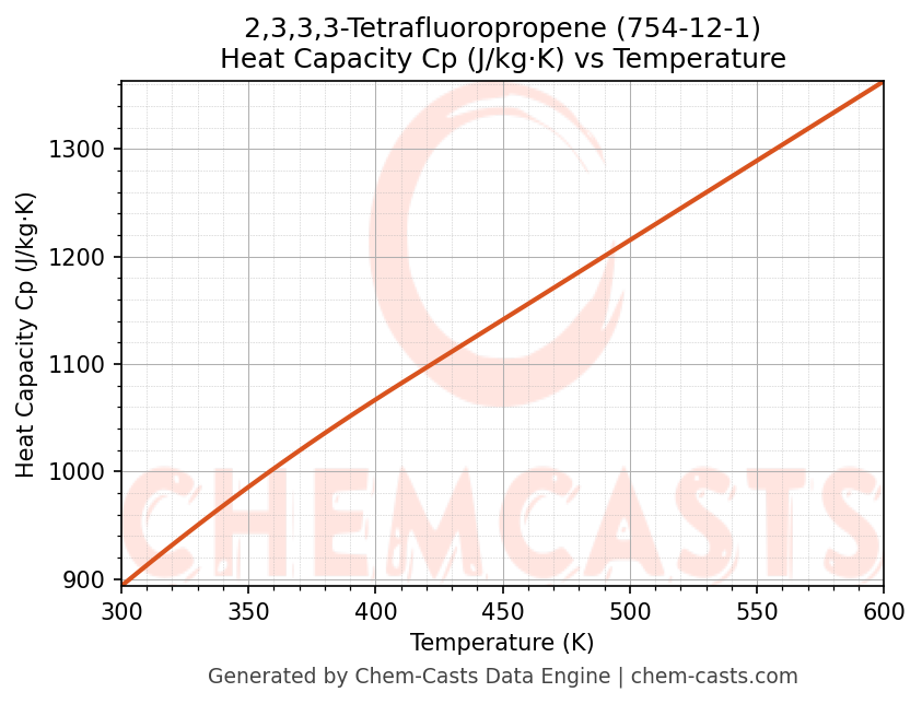 - Specific heat capacity (Cp) indicates the amount of energy required to raise the temperature of 2,3,3,3-Tetrafluoropropene and is critical for energy balance and heat-exchanger design.