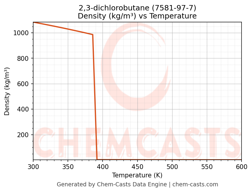 This page presents the temperature-dependent thermodynamic and transport properties of 2,3-dichlorobutane (CAS 7581-97-7) calculated at a constant pressure of 1 atm (101325 Pa) over the temperature range 250-500 K.