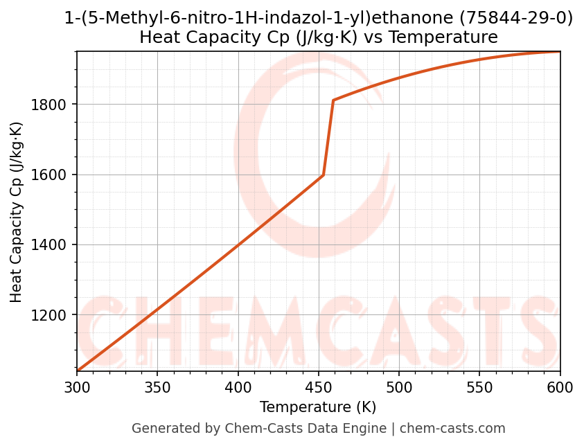 - Specific heat capacity (Cp) indicates the amount of energy required to raise the temperature of 1-(5-Methyl-6-nitro-1H-indazol-1-yl)ethanone and is critical for energy balance and heat-exchanger design.