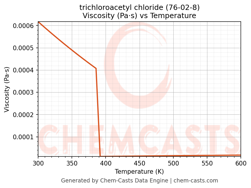 This page presents the temperature-dependent thermodynamic and transport properties of trichloroacetyl chloride (CAS 76-02-8) calculated at a constant pressure of 1 atm (101325 Pa) over the temperature range 250-500 K.