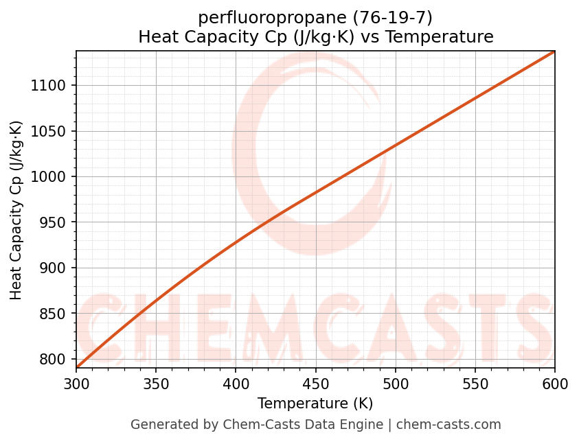 - Specific heat capacity (Cp) indicates the amount of energy required to raise the temperature of perfluoropropane and is critical for energy balance and heat-exchanger design.