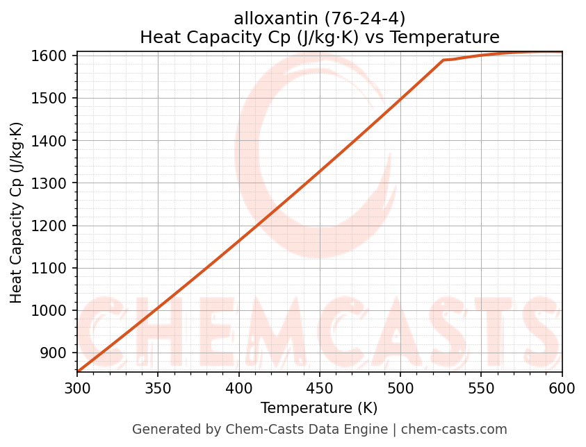 This page presents the temperature-dependent thermodynamic and transport properties of alloxantin (CAS 76-24-4) calculated at a constant pressure of 1 atm (101325 Pa) over the temperature range 250-500 K.