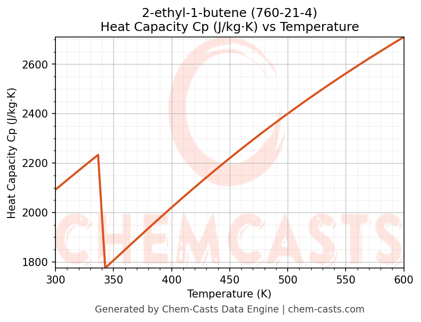 - Specific heat capacity (Cp) indicates the amount of energy required to raise the temperature of 2-ethyl-1-butene and is critical for energy balance and heat-exchanger design.
