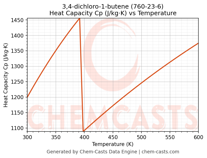 - Specific heat capacity (Cp) indicates the amount of energy required to raise the temperature of 3,4-dichloro-1-butene and is critical for energy balance and heat-exchanger design.