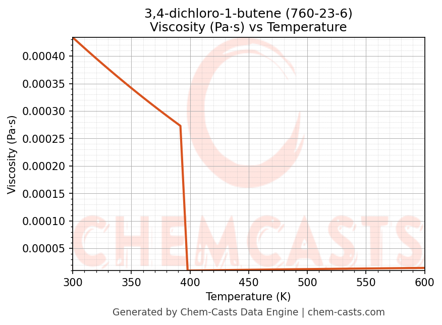 This page presents the temperature-dependent thermodynamic and transport properties of 3,4-dichloro-1-butene (CAS 760-23-6) calculated at a constant pressure of 1 atm (101325 Pa) over the temperature range 250-500 K.