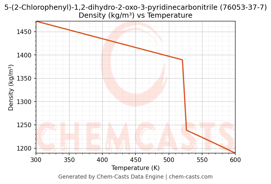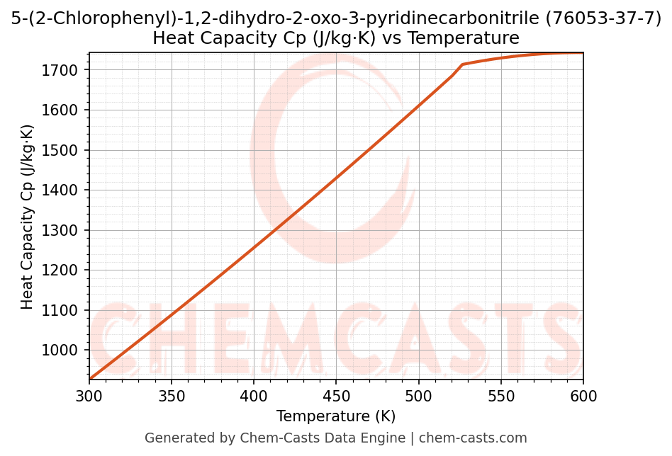 This page presents the temperature-dependent thermodynamic and transport properties of 5-(2-Chlorophenyl)-1,2-dihydro-2-oxo-3-pyridinecarbonitrile (CAS 76053-37-7) calculated at a constant pressure of 1 atm (101325 Pa) over the temperature range 250-500 K.