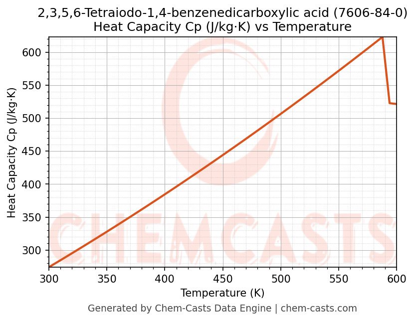- Specific heat capacity (Cp) indicates the amount of energy required to raise the temperature of 2,3,5,6-Tetraiodo-1,4-benzenedicarboxylic acid and is critical for energy balance and heat-exchanger design.