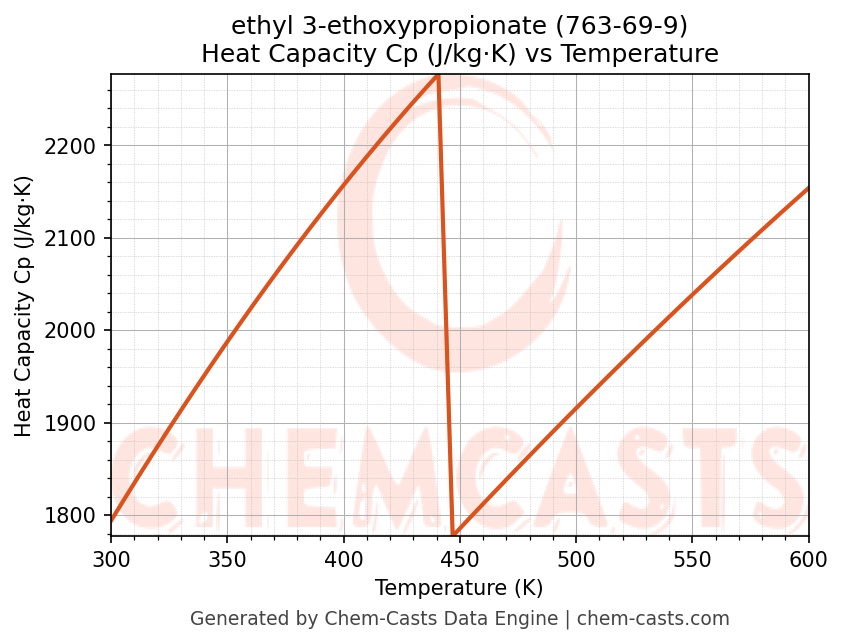 - Specific heat capacity (Cp) indicates the amount of energy required to raise the temperature of ethyl 3-ethoxypropionate and is critical for energy balance and heat-exchanger design.