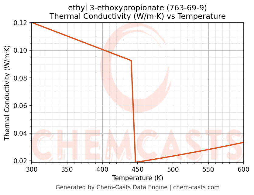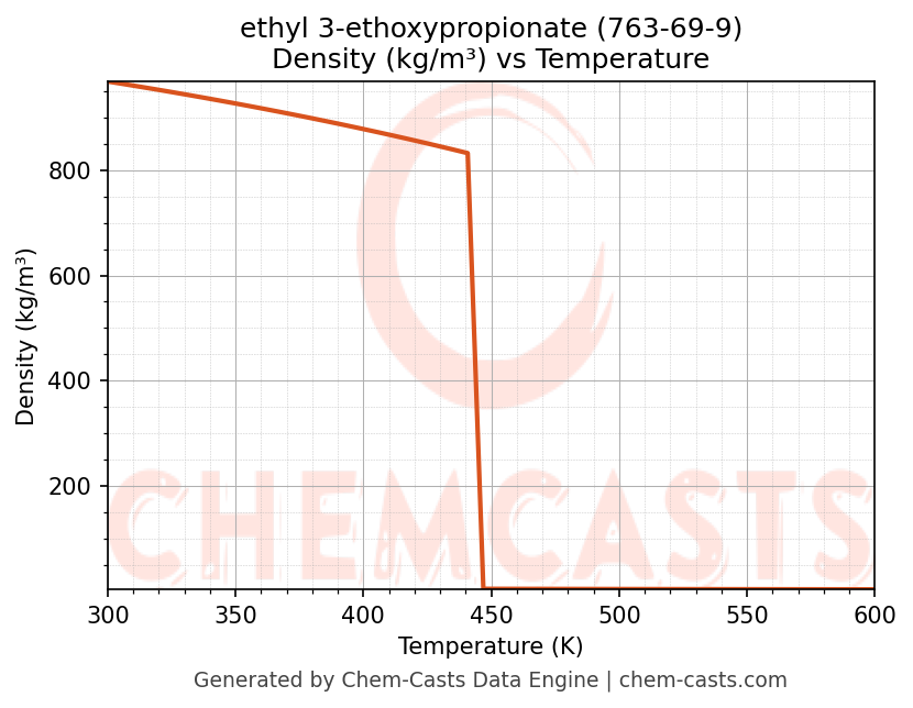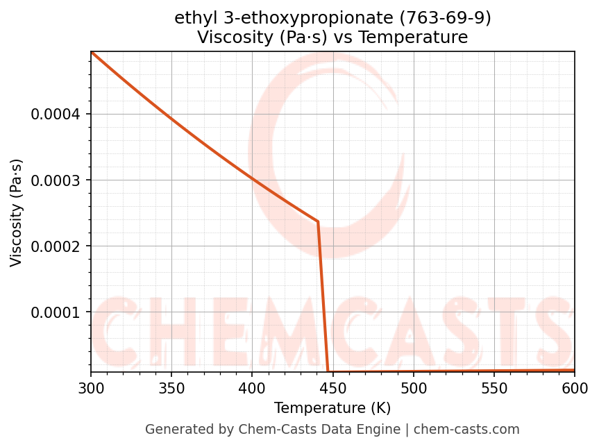 This page presents the temperature-dependent thermodynamic and transport properties of ethyl 3-ethoxypropionate (CAS 763-69-9) calculated at a constant pressure of 1 atm (101325 Pa) over the temperature range 250-500 K.