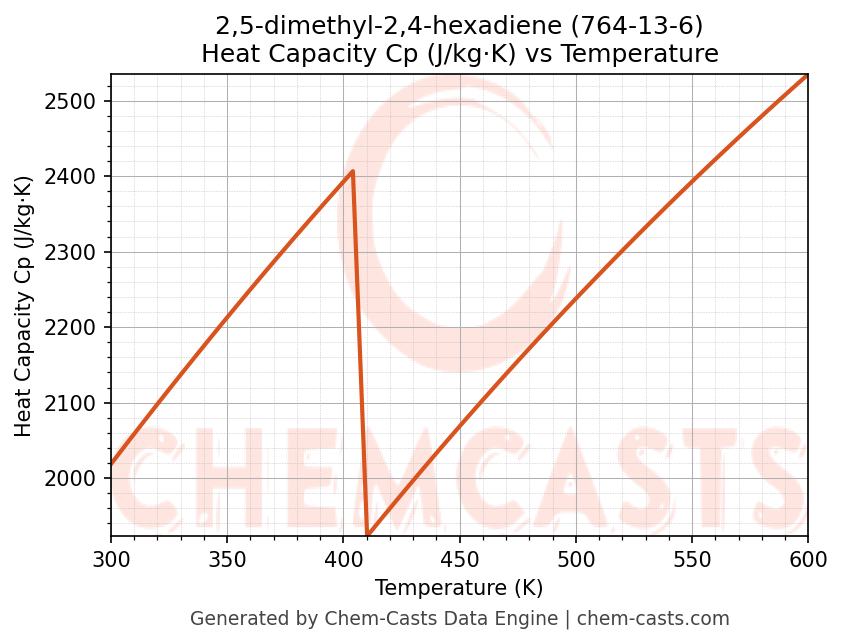 - Specific heat capacity (Cp) indicates the amount of energy required to raise the temperature of 2,5-dimethyl-2,4-hexadiene and is critical for energy balance and heat-exchanger design.