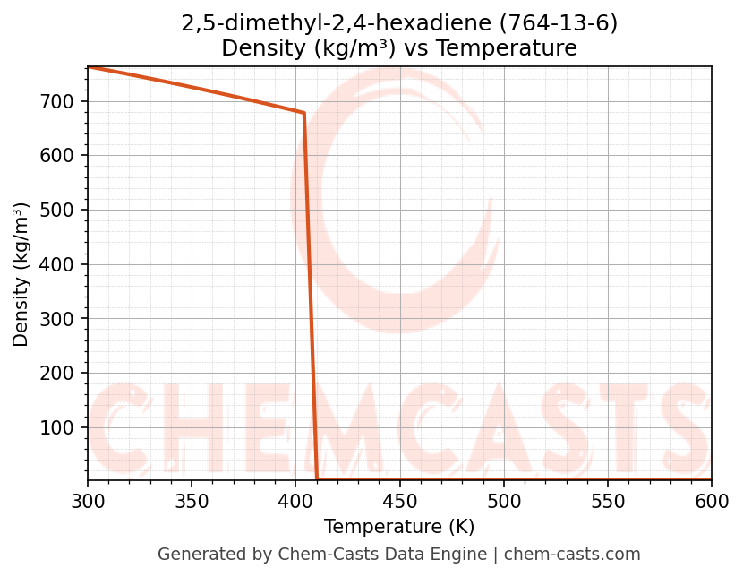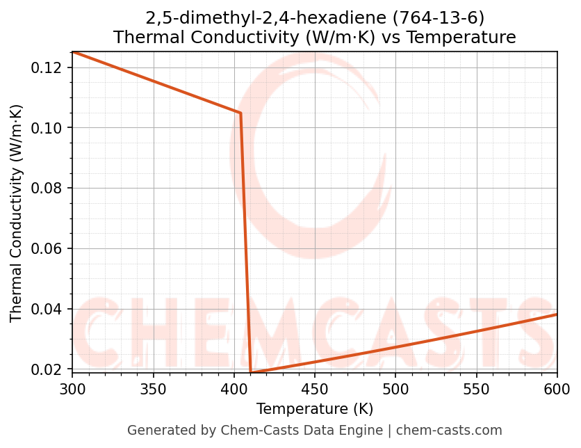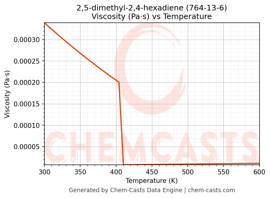 This page presents the temperature-dependent thermodynamic and transport properties of 2,5-dimethyl-2,4-hexadiene (CAS 764-13-6) calculated at a constant pressure of 1 atm (101325 Pa) over the temperature range 250-500 K.