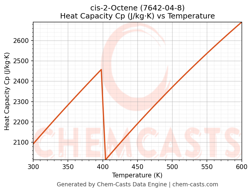 - Specific heat capacity (Cp) indicates the amount of energy required to raise the temperature of cis-2-Octene and is critical for energy balance and heat-exchanger design.