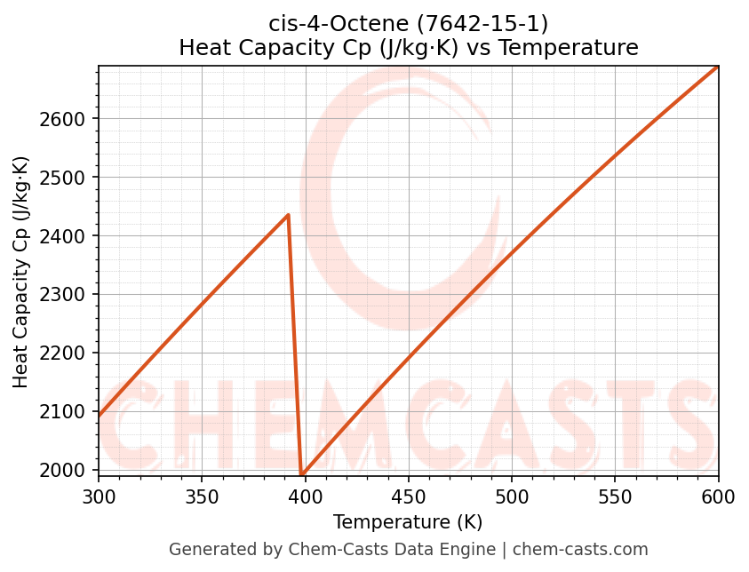 - Specific heat capacity (Cp) indicates the amount of energy required to raise the temperature of cis-4-Octene and is critical for energy balance and heat-exchanger design.