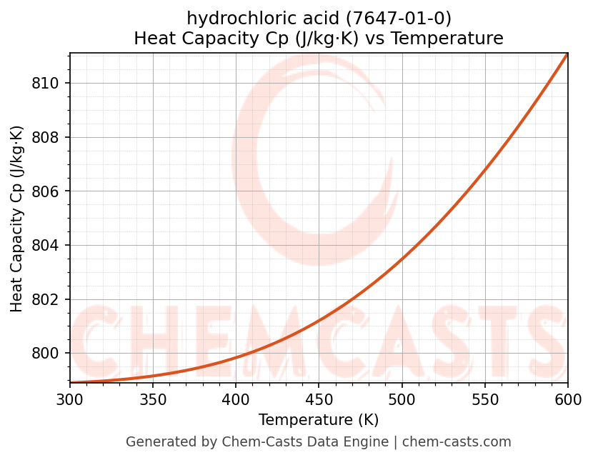 - Specific heat capacity (Cp) indicates the amount of energy required to raise the temperature of hydrochloric acid and is critical for energy balance and heat-exchanger design.