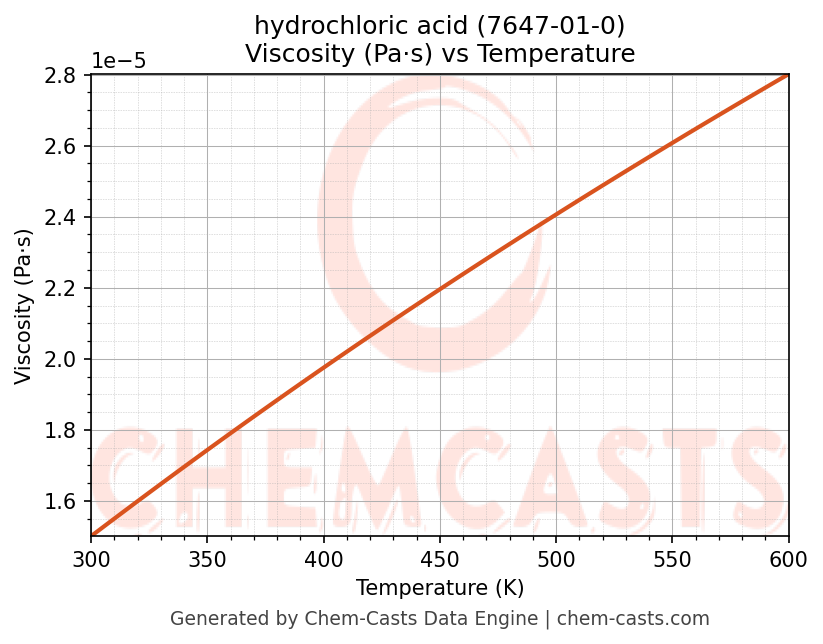 This page presents the temperature-dependent thermodynamic and transport properties of hydrochloric acid (CAS 7647-01-0) calculated at a constant pressure of 1 atm (101325 Pa) over the temperature range 250-500 K.