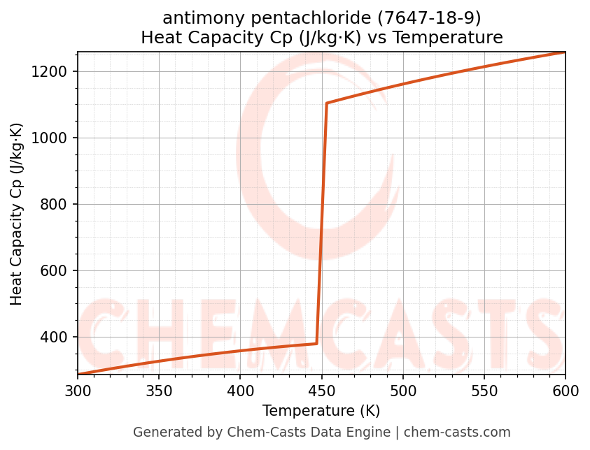 - Specific heat capacity (Cp) indicates the amount of energy required to raise the temperature of antimony pentachloride and is critical for energy balance and heat-exchanger design.
