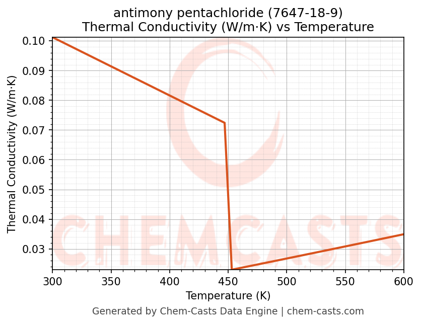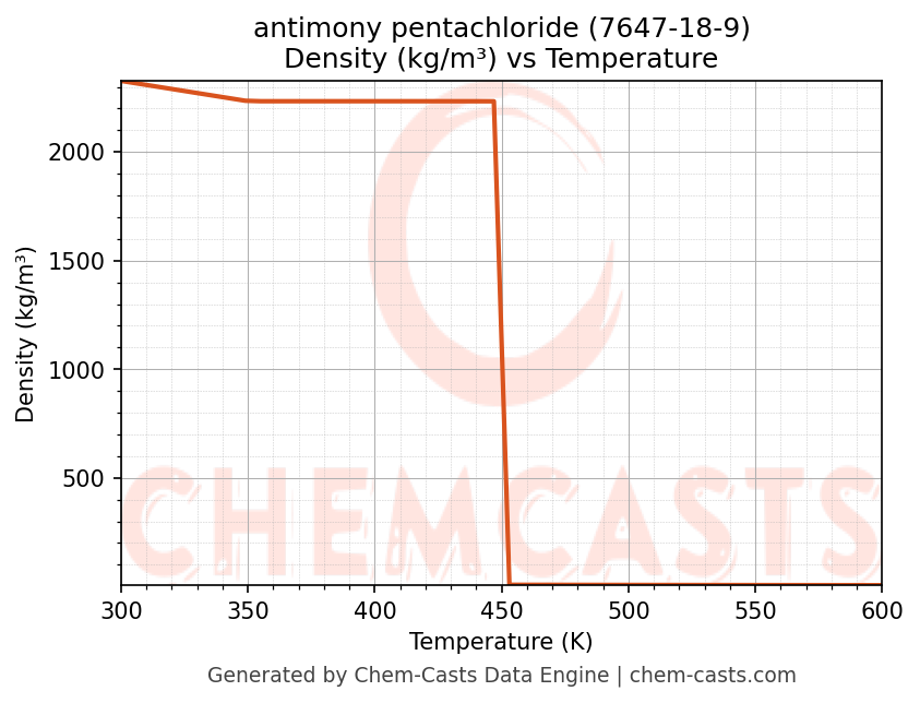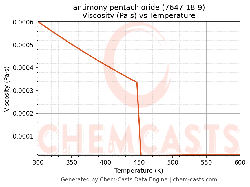 This page presents the temperature-dependent thermodynamic and transport properties of antimony pentachloride (CAS 7647-18-9) calculated at a constant pressure of 1 atm (101325 Pa) over the temperature range 250-500 K.