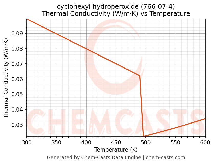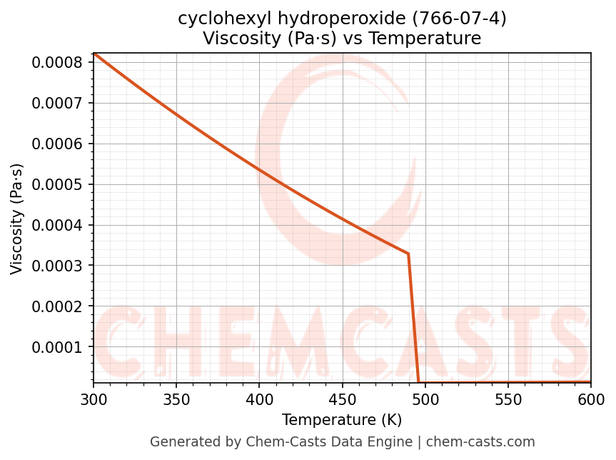 This page presents the temperature-dependent thermodynamic and transport properties of cyclohexyl hydroperoxide (CAS 766-07-4) calculated at a constant pressure of 1 atm (101325 Pa) over the temperature range 250-500 K.