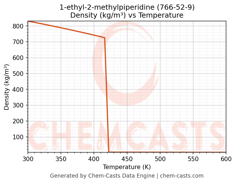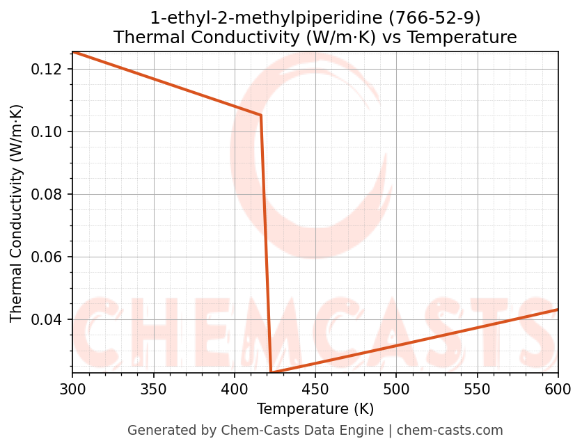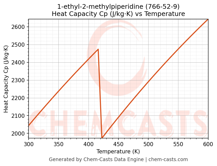 This page presents the temperature-dependent thermodynamic and transport properties of 1-ethyl-2-methylpiperidine (CAS 766-52-9) calculated at a constant pressure of 1 atm (101325 Pa) over the temperature range 250-500 K.