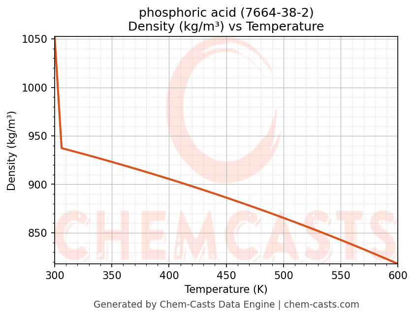 This page presents the temperature-dependent thermodynamic and transport properties of phosphoric acid (CAS 7664-38-2) calculated at a constant pressure of 1 atm (101325 Pa) over the temperature range 250-500 K.