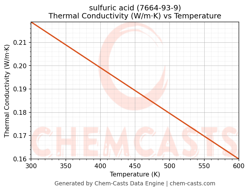 This page presents the temperature-dependent thermodynamic and transport properties of sulfuric acid (CAS 7664-93-9) calculated at a constant pressure of 1 atm (101325 Pa) over the temperature range 250-500 K.