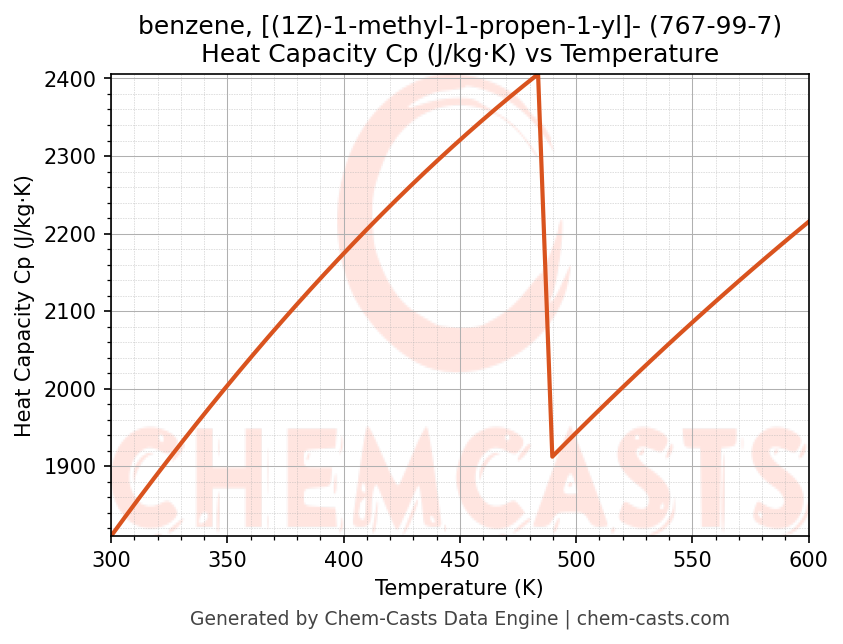 - Specific heat capacity (Cp) indicates the amount of energy required to raise the temperature of benzene, [(1Z)-1-methyl-1-propen-1-yl]- and is critical for energy balance and heat-exchanger design.