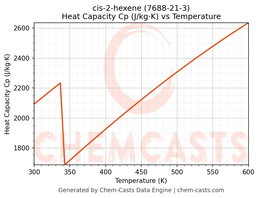 - Specific heat capacity (Cp) indicates the amount of energy required to raise the temperature of cis-2-hexene and is critical for energy balance and heat-exchanger design.