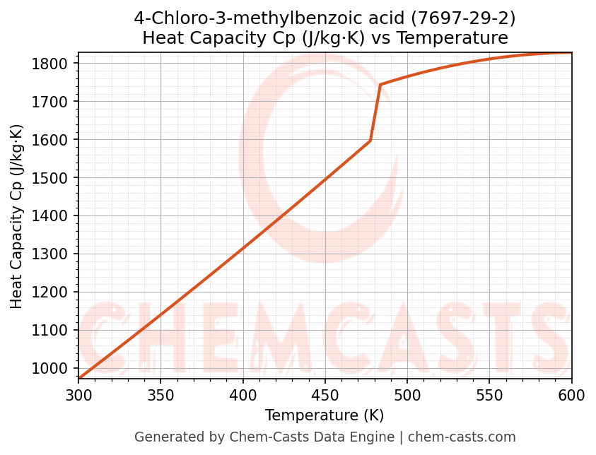 - Specific heat capacity (Cp) indicates the amount of energy required to raise the temperature of 4-Chloro-3-methylbenzoic acid and is critical for energy balance and heat-exchanger design.