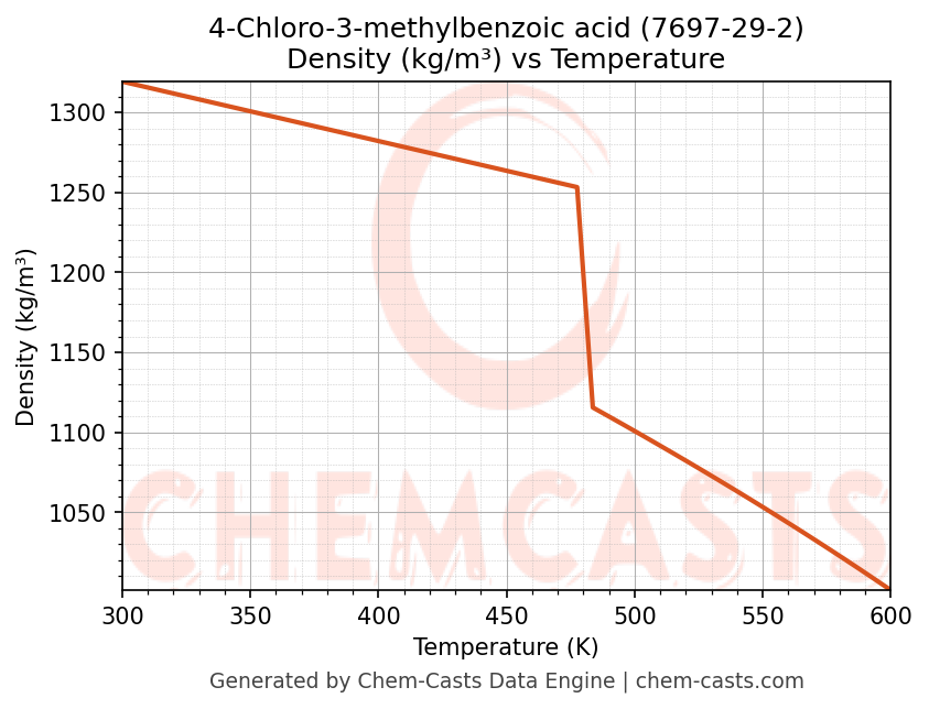 This page presents the temperature-dependent thermodynamic and transport properties of 4-Chloro-3-methylbenzoic acid (CAS 7697-29-2) calculated at a constant pressure of 1 atm (101325 Pa) over the temperature range 250-500 K.