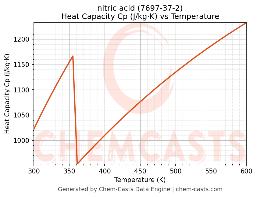 - Specific heat capacity (Cp) indicates the amount of energy required to raise the temperature of nitric acid and is critical for energy balance and heat-exchanger design.