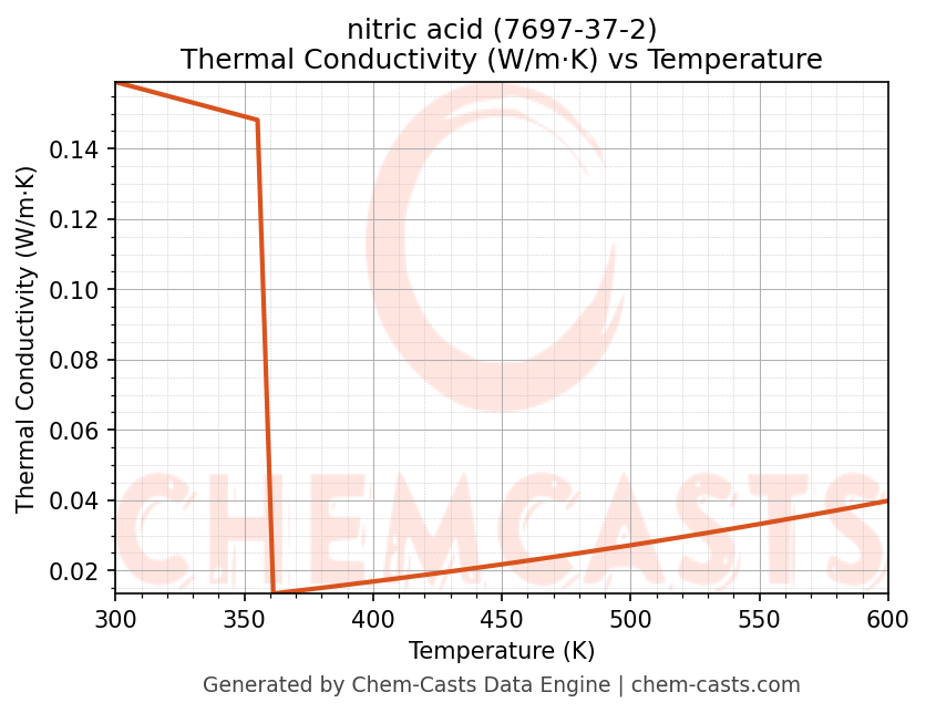 This page presents the temperature-dependent thermodynamic and transport properties of nitric acid (CAS 7697-37-2) calculated at a constant pressure of 1 atm (101325 Pa) over the temperature range 250-500 K.