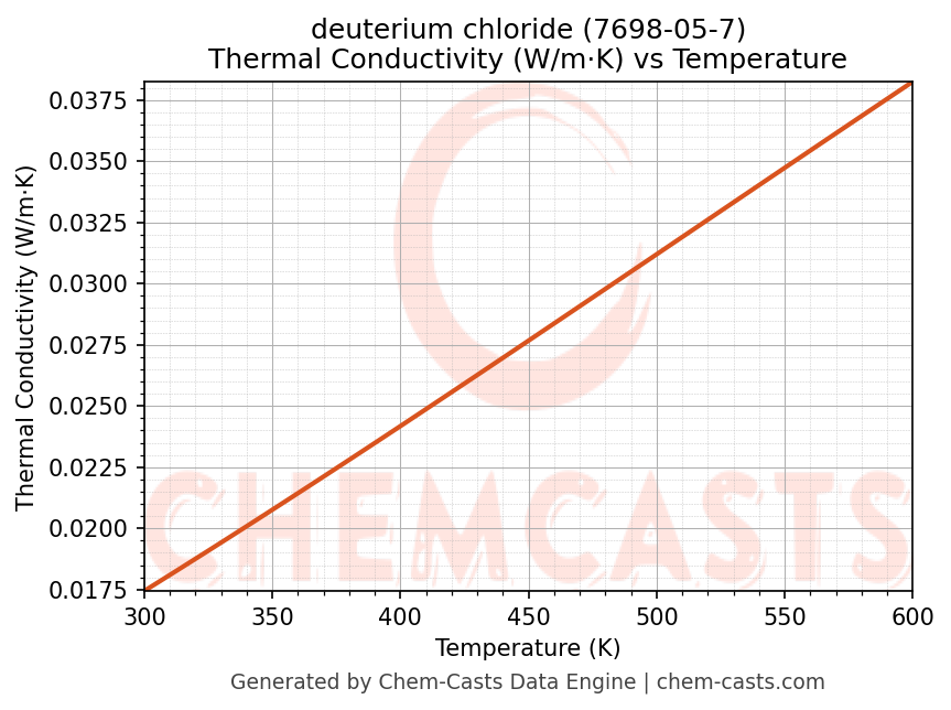 This page presents the temperature-dependent thermodynamic and transport properties of deuterium chloride (CAS 7698-05-7) calculated at a constant pressure of 1 atm (101325 Pa) over the temperature range 250-500 K.