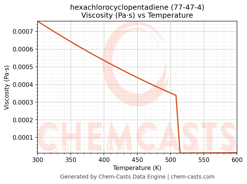 This page presents the temperature-dependent thermodynamic and transport properties of hexachlorocyclopentadiene (CAS 77-47-4) calculated at a constant pressure of 1 atm (101325 Pa) over the temperature range 250-500 K.