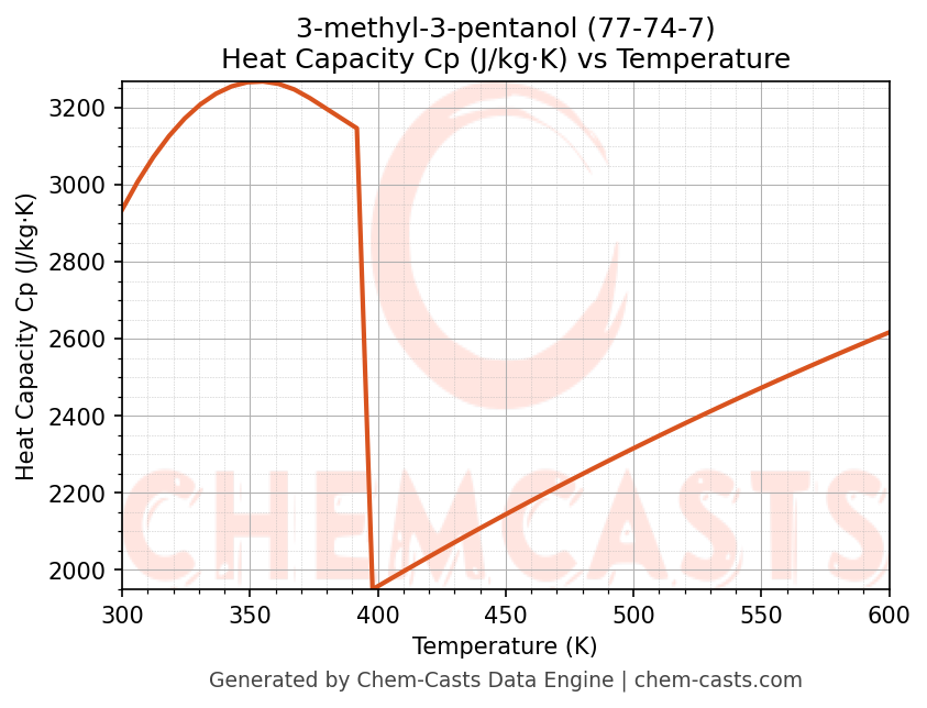 - Specific heat capacity (Cp) indicates the amount of energy required to raise the temperature of 3-methyl-3-pentanol and is critical for energy balance and heat-exchanger design.