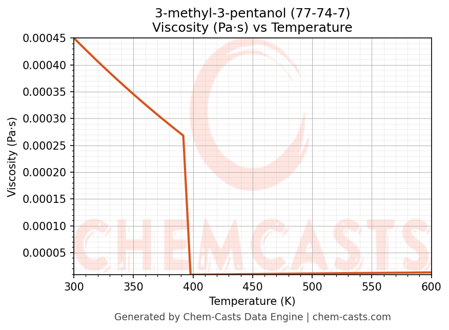This page presents the temperature-dependent thermodynamic and transport properties of 3-methyl-3-pentanol (CAS 77-74-7) calculated at a constant pressure of 1 atm (101325 Pa) over the temperature range 250-500 K.