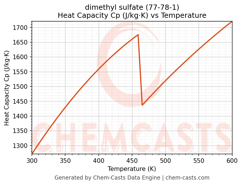 - Specific heat capacity (Cp) indicates the amount of energy required to raise the temperature of dimethyl sulfate and is critical for energy balance and heat-exchanger design.